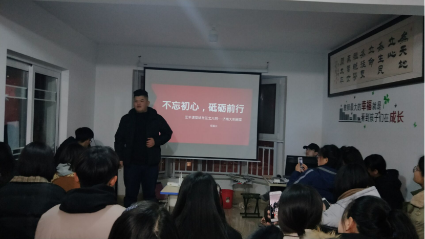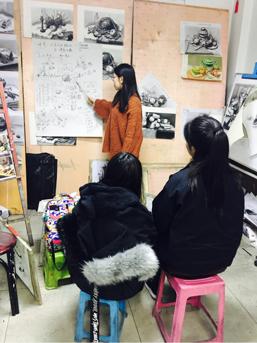 第二站,前往大明画室。济南大明画室是艺术课堂进社区的第二站,也是社会实践小分队实践时长最长的一站。在实践活动中,分队成员主要负责速写、素描等基础性教学工作,向高一、高二阶段的学生讲解绘画技巧、绘画构思、步骤以及向他们传授整体绘画的思想,并把大学期间所学的知识以PPT及范画的形式分享给学生们。同时,小分队成员还负责学生的课后作业以及生活作息管理,督促他们顺利完成作业,合理有效安排作息时间,提高学习效率。
