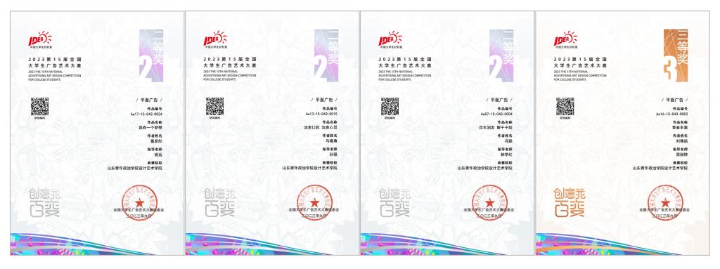 近日,第十五届全国大学生广告艺术大赛省赛及国赛获奖名单陆续公布。在竞争激烈的比赛中,设计艺术学院视觉传达设计专业众多学生作品脱颖而出,共取得国赛二等奖3项、三等奖1项、优秀奖1项;省赛二等奖2项、三等奖1项、优秀奖27项。相比去年,今年参赛成果又有新的突破!