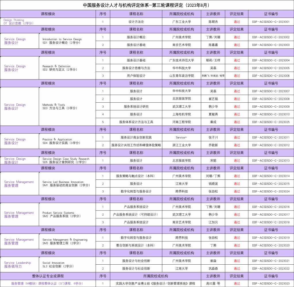 “DDF中国服务设计人才与机构评定体系”是国内首个服务设计行业资质认定体系,是由北京光华设计发展基金会组织国内外数十位行业和学术专家共同设计的一套服务设计领域的课程标准体系,包含设计思维以及服务设计、服务管理、服务领导力三个层次能力模块,旨在推动“服务设计师”的职业定位、职业发展和职业技能评估,为第三产业、服务贸易和服务外包等领域培养跨领域复合型人才。本轮申报经课程评定专家组在线或通讯评审,最终全国两岸四地高等院校的27门课程通过评定。