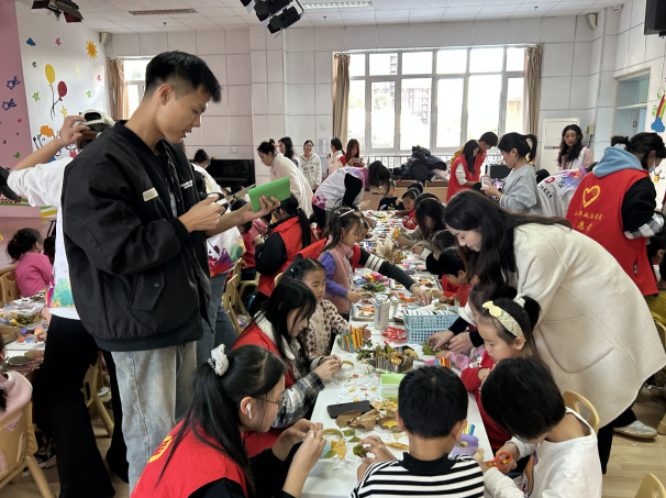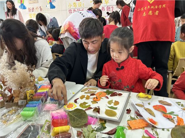 在历城区钢城第二幼教集团华夏园,志愿者们与小朋友们开展了一场别开生面的手工活动,利用清理得来的落叶,发挥专业特长,耐心指导小朋友们动手制作各种有趣的手工作品,活动现场笑声不断,氛围轻松愉悦,孩子们在这个过程中体会到了劳动美、艺术美,感受到了团队协作的乐趣。