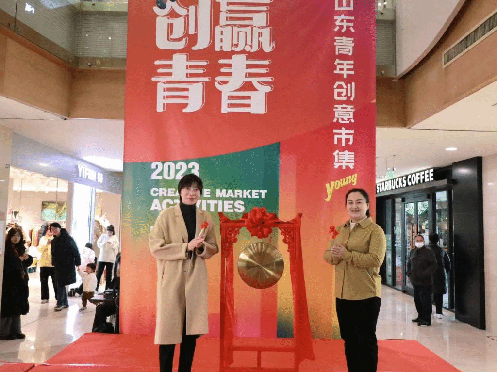 仪式上,山东银荷商业运营管理有限公司运营经理薛娜、山东青年政治学院设计艺术学院党委书记薛卿为“创意市集”鸣锣开市。