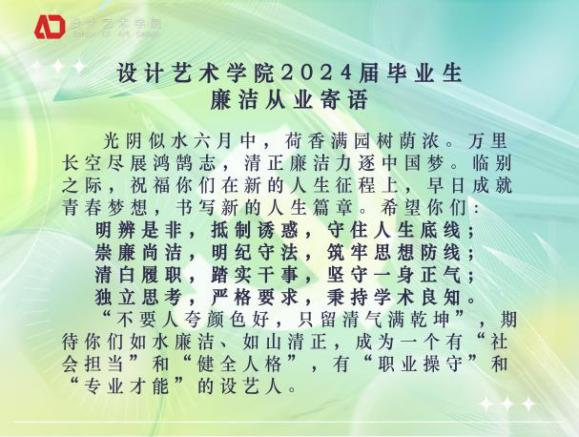 为深入学习贯彻习近平总书记关于党纪学习教育的重要讲话和重要指示精神,进一步推进党纪学习教育,为毕业生系好廉洁从业的“第一粒扣子”。骊歌响起,毕业六月,设计艺术学院党委开展了形式多样、内容丰富的廉洁教育活动。