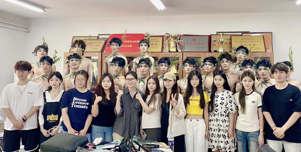 活动现场,团队主要负责《雨涧春行》《竹石风骨》两部舞蹈剧目的演员形象设计与化妆。团队根据剧目主题、情节和演员形态特点,以春雨后万物复苏的自然生命力为特点设计了以嫩绿色为主题的彩绘眼妆,着重凸显妆容的清秀精致和立体,为女群舞《雨涧春行》打造了玲珑清秀的妆容。为男群舞《竹石风骨》设计以竹子为元素的人体彩绘,将男子气概与竹子的强劲相结合,凸显了朝气蓬勃的舞台形象。在化妆过程中,学生们充分发挥了专业知识和技能,巧妙运用各种化妆工具和材料,为舞蹈演员们打造出完美的形象,团队展现了极高的专业素养和团队合作精神。
