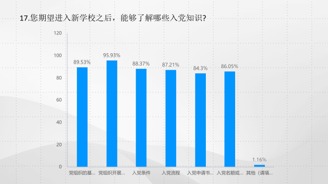 为了针对性做好新生的入党启蒙教育,学院设计制作“设计艺术学院2024级新生入党意愿和入党动机调查问卷”,并面向全体新生发布。通过设置新生基本信息、高中/专科阶段对党的认识与入党意愿、进入大学后的入党意愿和入党动机三个板块共18个问题,调研学生的思想状态。