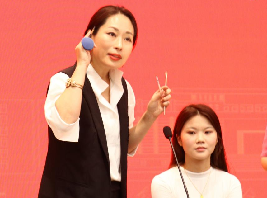 随后,郑春实对合作院校韩国诚信女子大学的介绍了韩国诚信女子大学的基本情况,并就学生访学、暑期研修、学历深造等方面进行了详细介绍。韩国诚信女子大学美妆融合研究生院院长金周德教授,美妆时尚产业国际学院院长文允璟教授,向同学们强调了学习韩国语言的重要性,期待学院学生前往韩国学习深造。韩志洙教授对于韩国2024年度美妆趋势展开分析,时尚美妆造型进行现场示范与讲解。