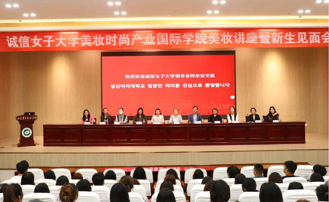10月10日下午,韩国诚信女子大学美妆讲座暨新生见面会于图书馆西报告厅顺利召开。韩国诚信女子大学美妆融合研究生院院长金周德,美妆时尚产业国际学院院长文允璟,美妆产业系主任韩志洙,国际交流支援组中华区国际交流主管郑春实受邀出席。设计艺术学院党委书记薛卿、副院长徐彩、团总支书记李耀辉、艺术设计中韩形象设计教研室教师以及2024级艺术设计(中外合作)专业全体学生参加会议。
