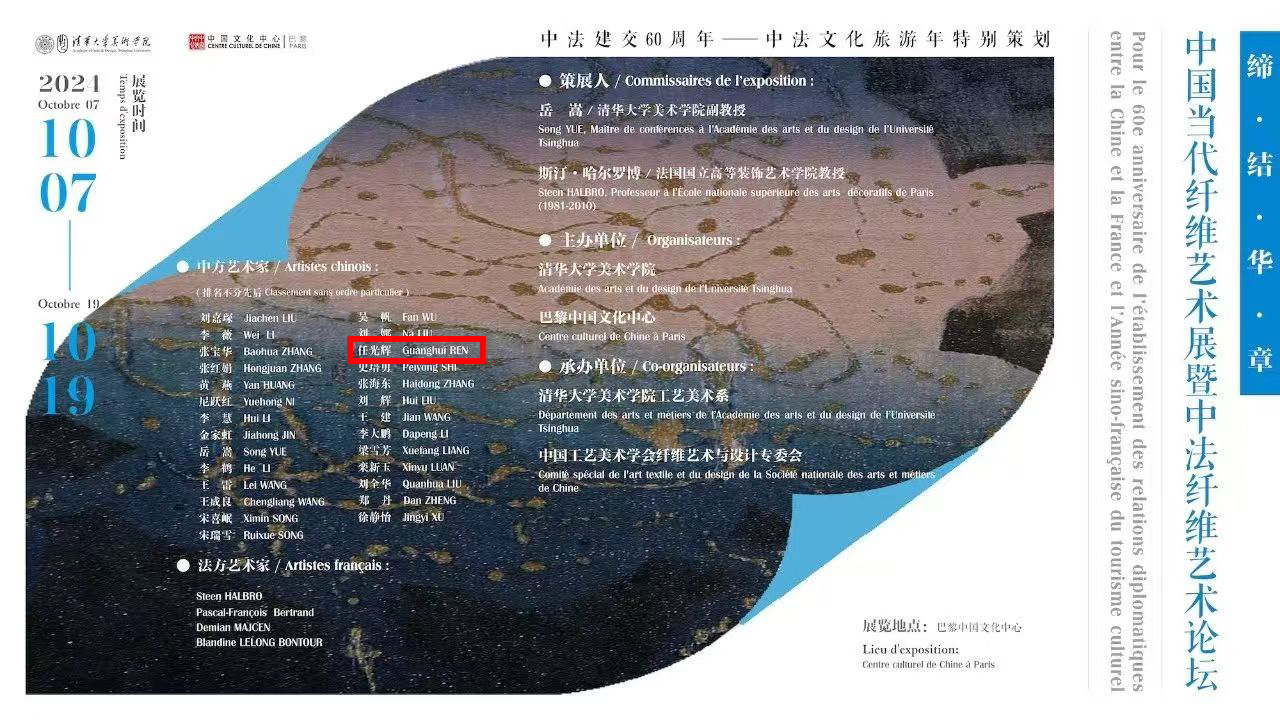 10月7日至10月19日,由清华大学美术学院与巴黎中国文化中心共同主办,清华大学美术学院工艺美术系与中国工艺美术学会纤维艺术与设计委员会共同承办的“缔结华章——中国当代纤维艺术展暨中法纤维艺术论坛”在法国巴黎塞纳河畔的中国文化中心成功举办。设计艺术学院教授任光辉作品应邀参展。