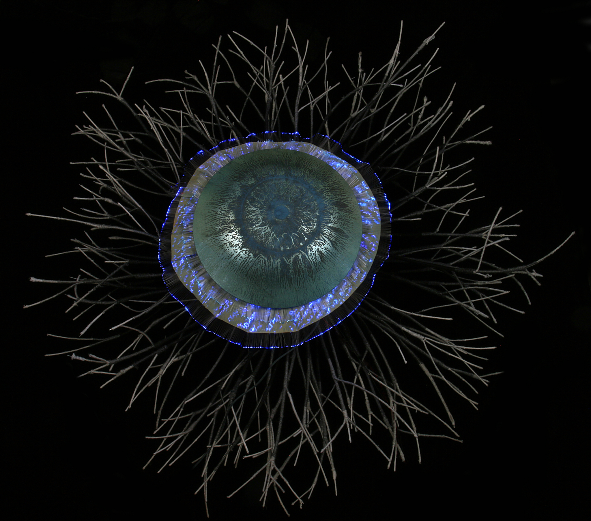 任光辉教授参展作品《瞳》以光纤织物为媒介,运用激光镭射技术在许多大小不一的圆形织物上呈现人类眼球虹膜意像。其中的发光织物应用声控技术,通过对电流的设计实现音频与光信号的转化,发光的调度及节奏可以根据音乐的起伏实现同步变化。光导纤维织物流出的光源色彩与设定的音乐旋律一同闪烁波动,观众通过耳机则听到刺耳的机械噪音。这件作品将光导纤维材料、激光镭射技术、数码编织技术、音控交互技术结合在一起,不仅提升了纤维艺术作品的视觉感受,并扩展到听觉、交互等全方位的感知。任光辉教授以其独特的艺术语言,呈现出艺术家对于纤维艺术多元发展的积极探索。