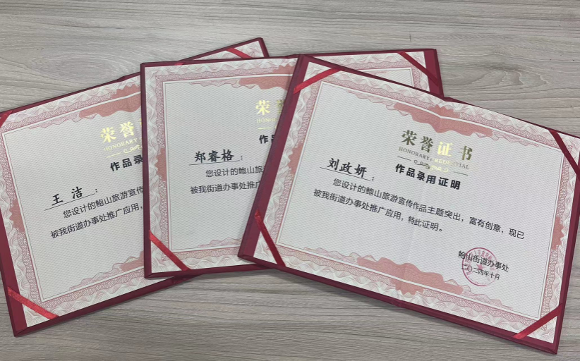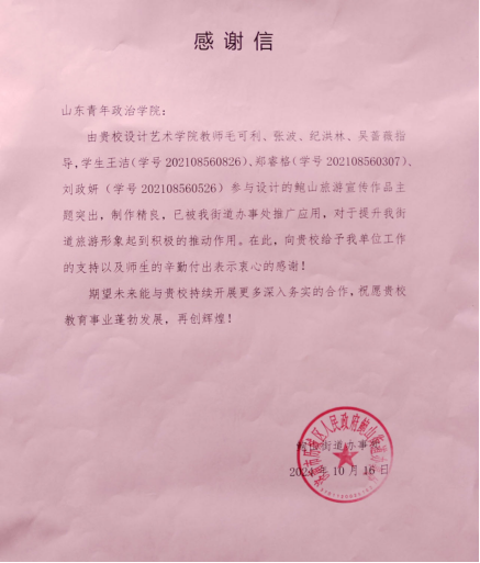 10月16日,鲍山街道办事处为表彰设计艺术学院数字媒体工作室师生在鲍山文旅宣传方面的努力,特发来感谢信和荣誉证书,高度肯定了课程团队在促进地方文化建设中所作出的贡献。