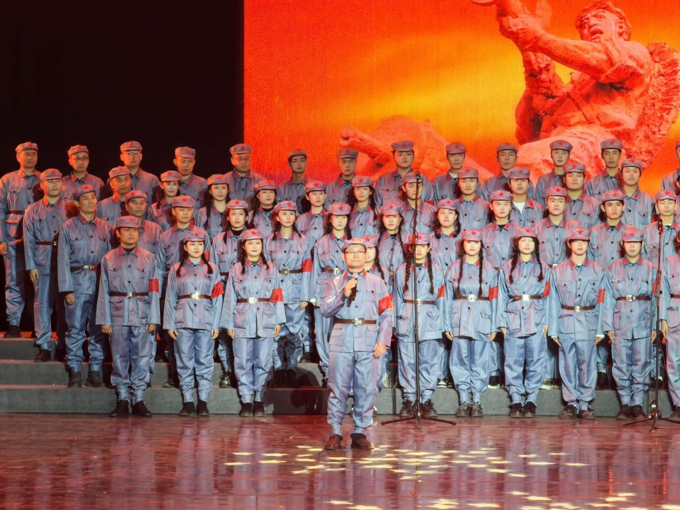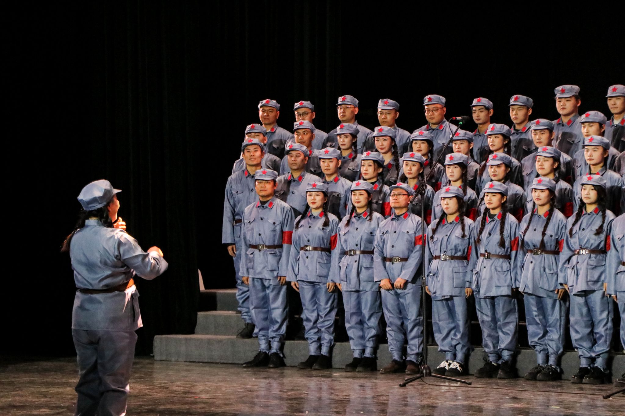 展演现场,设计艺术学院师生合唱团身着整齐服装,精神抖擞地登上舞台。随着指挥棒的扬起,歌曲《弹起我心爱的土琵琶》的悠扬旋律在设计艺术学院院长张博的独唱下缓缓升起。歌声时而舒缓悠扬,如月光洒落大地;时而饱含深情,似诉说着往昔的峥嵘岁月,瞬间将现场观众带入那段激情燃烧的革命年代。