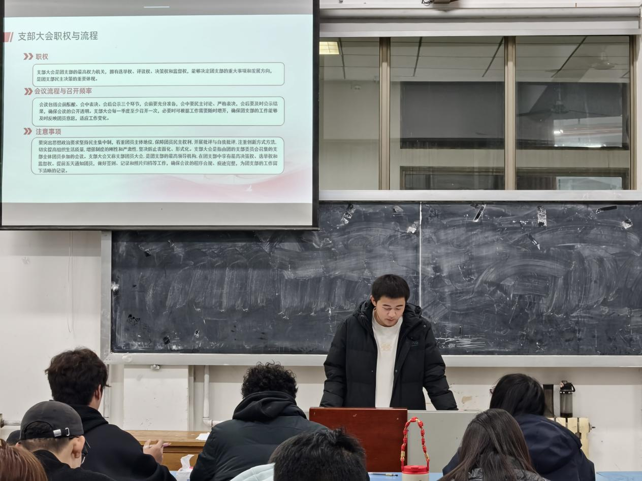 培训中,贾翔源系统阐释了“三会两制一课”的制度内涵与核心要义,并分模块进行了实务解读。他详细讲解了支部大会、支部委员会、团小组会的职权、规范流程与注意事项;明确了“团员教育评议制度”的评议要求等次标准与“团员年度团籍注册制度”的执行要点;并结合实例,说明了团课的教育内容、开展形式与目标频次。讲解紧扣实际操作,为新任团干部提供了清晰的工作指南。