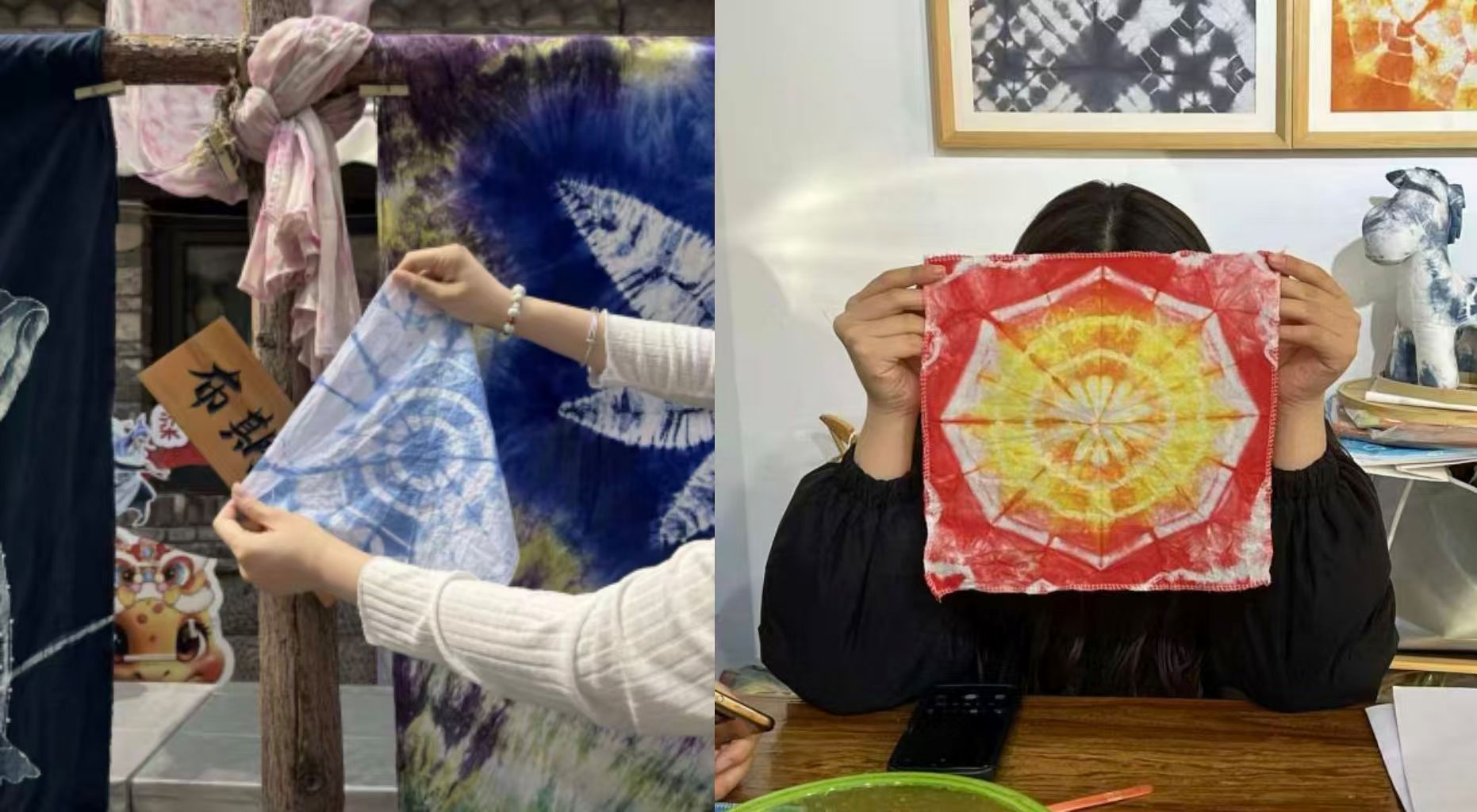 团队成员深入扎染工坊与民俗村落,专程走访扎染技艺传承人,聆听非遗坚守故事,全程观摩选布、扎结、染色、晾晒的完整工艺流程,细致记录传统纹样寓意与古法技艺操作细节。团队结合新春生肖、福字、祥云等年味元素,搭建起文化传承与节日氛围交融的素材库,在触摸古法技艺的过程中筑牢实践根基,深刻领会传统工艺的匠心底蕴,进一步增强了传承中华优秀传统文化的责任感。