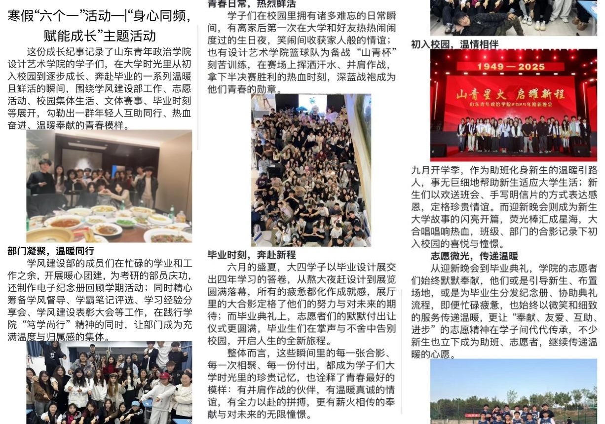 为深入落实学校2026年寒假“六个一”学风建设主题活动部署,锚定“学思践悟强本领,躬身力行促成长”行动导向,全面提升学生综合素养,设计艺术学院于寒假期间精心开展“身心与记忆共融成长计划”主题实践活动,通过多元特色板块设计,引导学生在身心同修与记忆沉淀中实现自我提升,为青春之路积蓄前行力量。