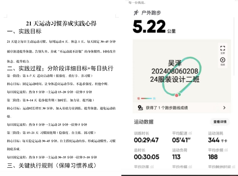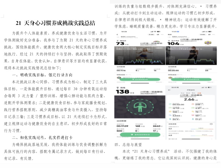 本次“身心与记忆共融成长计划”设置“21天身心习惯养成计划”与“记忆博物馆”两大核心板块。其中,“21天身心习惯养成计划”以锤炼意志品格、提升自律能力为核心目标,鼓励同学们跳出舒适圈、向内探索自我。学生们从规律作息、科学饮食的基础习惯养成,到有氧运动、力量训练的循序渐进开展,更有部分学生创新开展自然观察等特色实践,学生们以日复一日的坚持,实现了从“被动完成任务”到“主动热爱生活”的转变。全体参与同学均圆满完成21天打卡挑战,让自律的种子深植心底,为新学期学习生活筑牢坚实的身心基础。