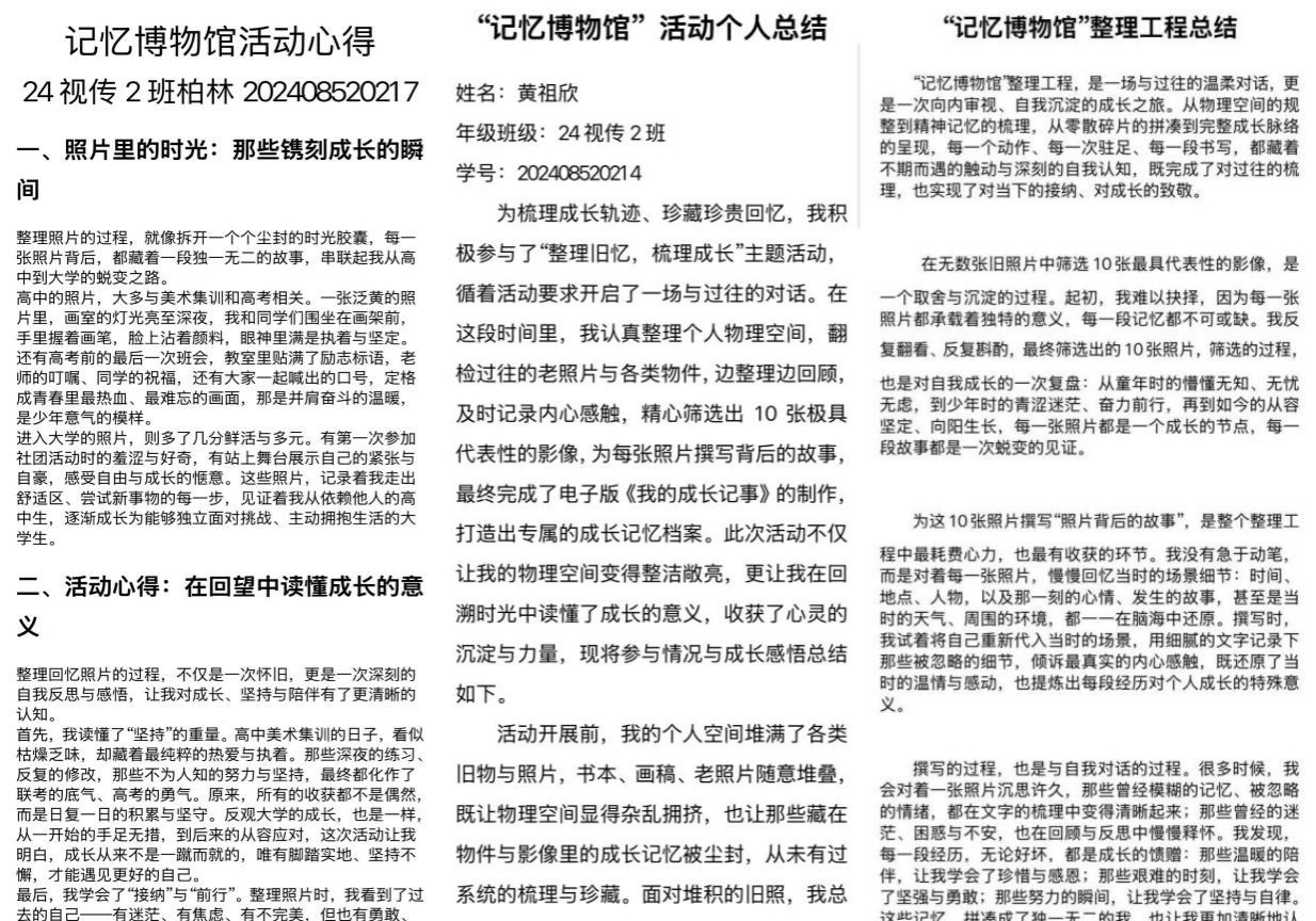 “记忆博物馆”板块则以“唤醒时光印记,留存青春温度”为主题,为学生搭建了表达自我、梳理成长、凝聚力量的优质平台。活动中,同学们以镜头、文字、手作为载体,翻检过往照片、物件,梳理从高中到大学的成长轨迹,将零散的记忆碎片汇聚成专属的青春档案。大家精心筛选代表性影像,撰写背后的成长故事,制作电子版《我的成长记事》,在整理与回顾的过程中,重温并肩奋斗的温暖,感悟坚持与成长的意义,学会接纳过往的不完美,从珍贵记忆中汲取前行的勇气与力量。同时,活动以记忆为纽带,让学子们在分享与交流中锤炼感知美好的能力,凝聚起温暖向上的集体力量,进一步深化了对青春、成长与陪伴的理解。