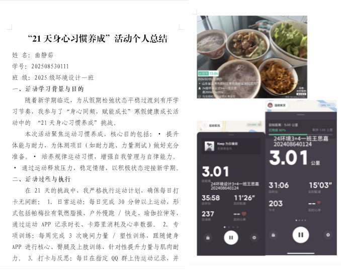 此次“记忆与身心共生计划”的圆满开展,是设计艺术学院深入落实学风建设要求、提升学生综合能力的重要实践举措,既让学生们在寒假期间实现了身心的双重成长,也在实践中懂得了坚持的意义、成长的价值。未来,设计艺术学院将继续以各类特色主题活动为重要抓手,深耕学风建设内涵,持续关注学生身心成长,引导广大青年学子将自律坚持的优良品格融入学习生活的方方面面,以强健的体魄、坚定的意志、饱满的精神,在青春的赛道上脚踏实地、奋勇争先,书写属于新时代青年的成长华章。