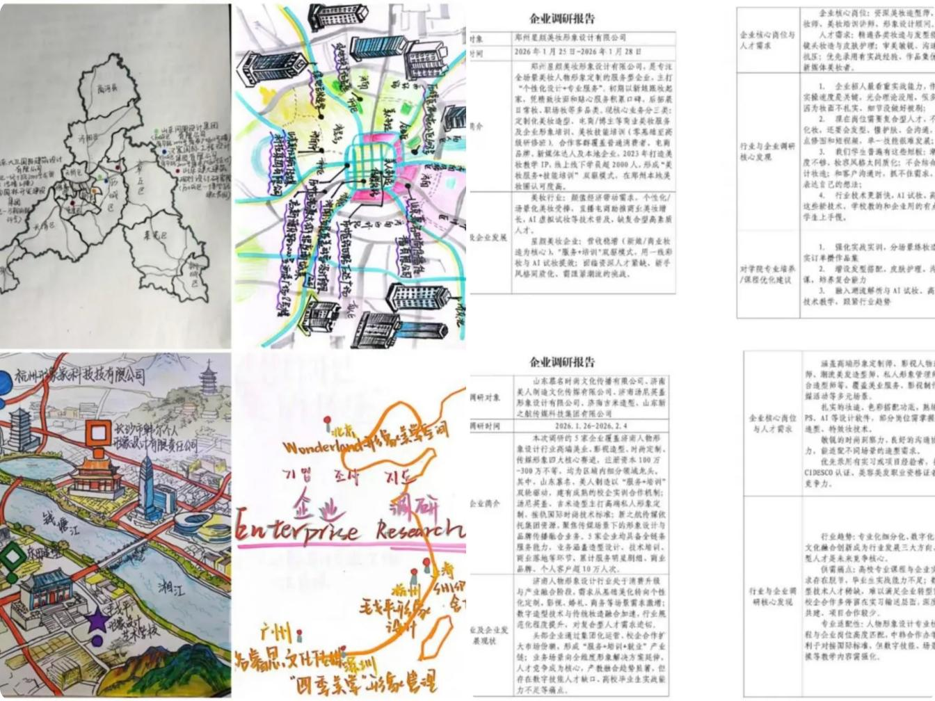 “探行业趋势·明职业方向”专业调研实践活动引导学生深入行业一线,在实践中明晰职业定位,为未来职业发展筑牢根基。学生选取家乡设计类企业、机构为调研对象,撰写专业调研报告、制作调研手绘地图,通过文献研究、数据梳理、企业走访等方式收集信息,形成兼具深度与创意的调研成果。调研报告系统梳理行业发展现状与人才需求,提出个人职业规划思考;调研手绘地图则彰显设计专业特色,以生动笔触呈现企业分布与行业脉络,充分体现学生专业功底,凸显实践成效。