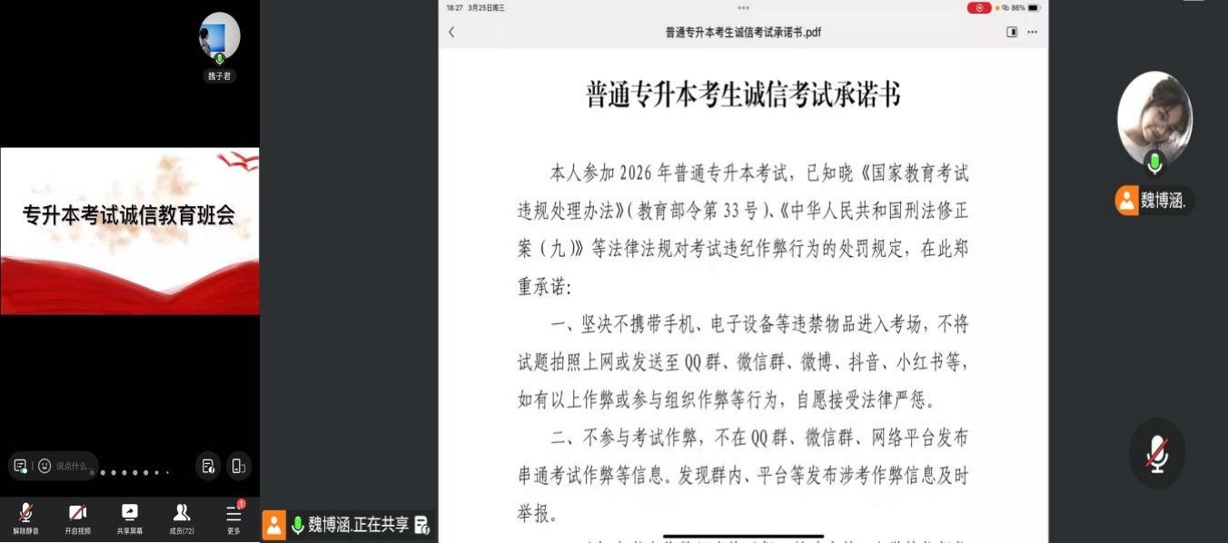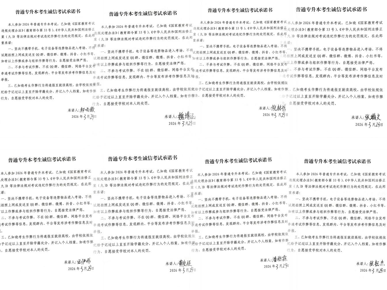 严格压实工作责任,确保教育工作落地见效。各班级严格按照学院要求,在考风考纪教育主题班会上,集中组织全体考生签署《普通专升本考生诚信考试承诺书》,每位考生认真研读承诺书上的每项条款,深刻领会诚信应考的内涵与责任,在承诺书上郑重签下自己的姓名,以书面形式作出坚守诚信、拒绝作弊的庄严承诺。