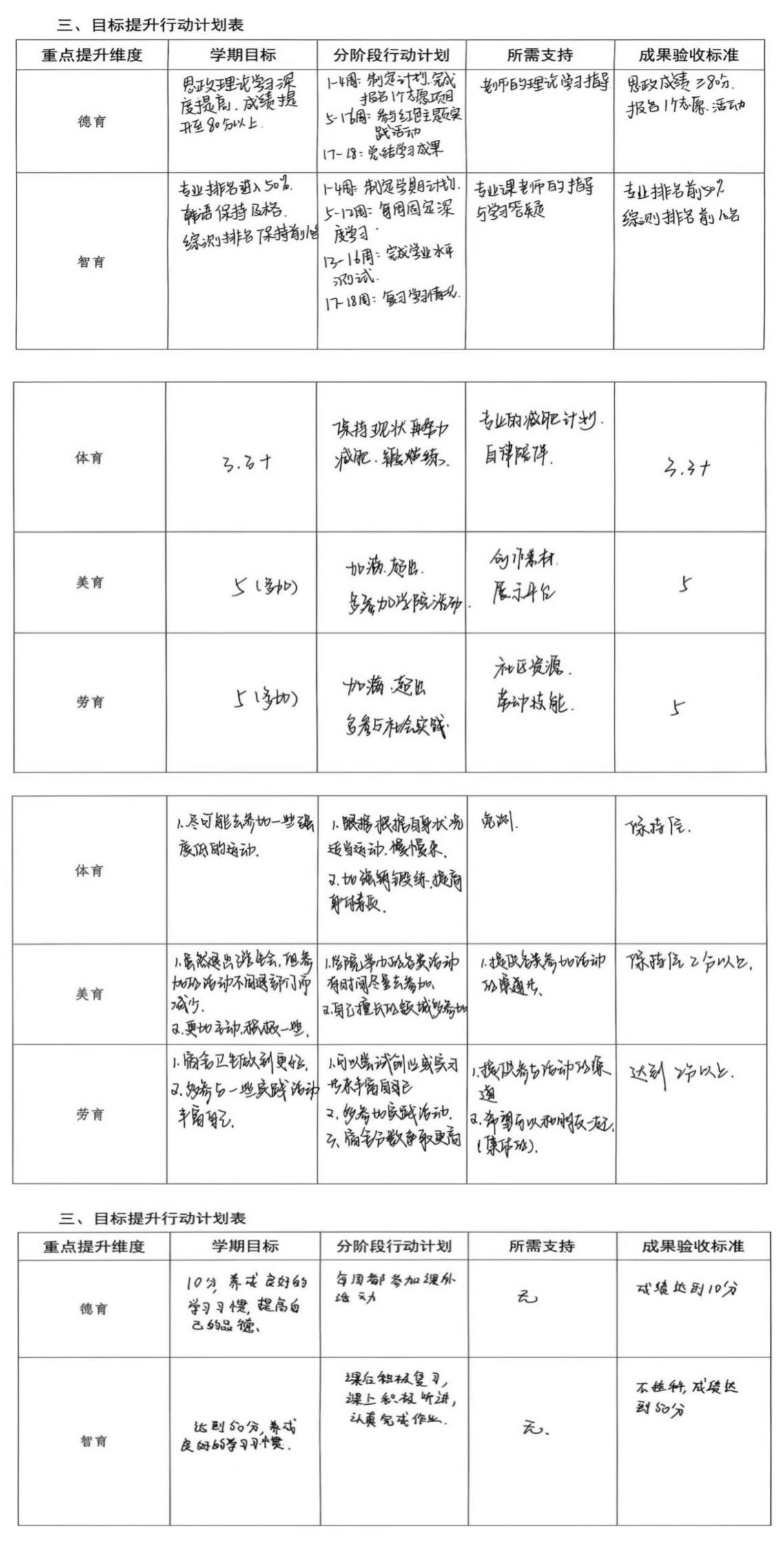 在诊断基础上,学生进一步填写《目标提升行动计划表》,围绕五育分别设定学期总体目标,并分解为阶段性任务,明确所需资源支持及可量化、可评价的成果验收标准。该表引导学生将宏观目标转化为具体行动,强化了学习与发展的路径性和可控性,为新学期的个人提升提供了清晰的“行动地图”。